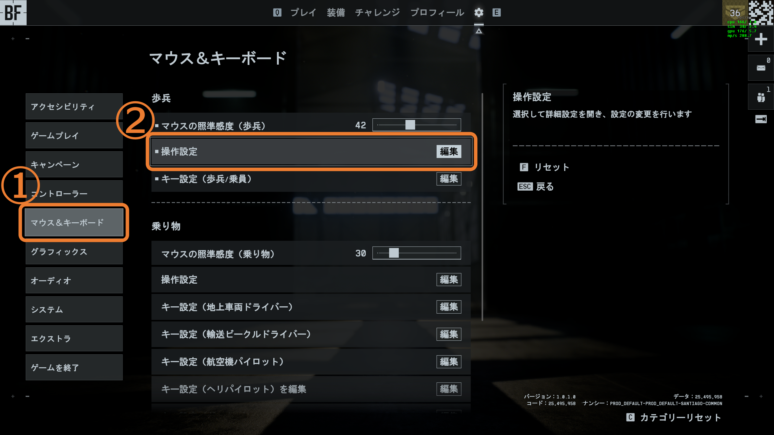 設定を開いて①「マウス&キーボード」の「操作設定」を選択