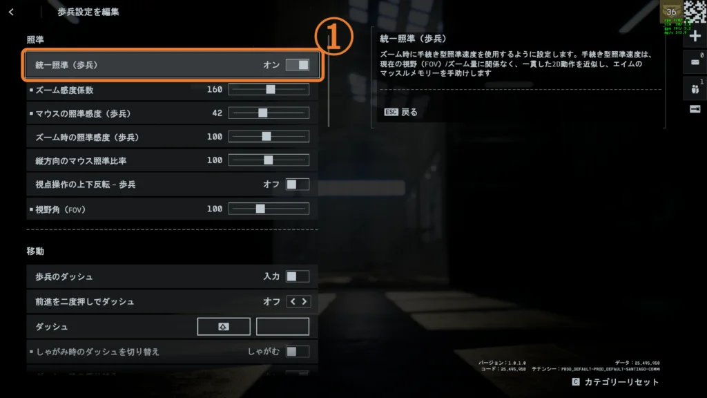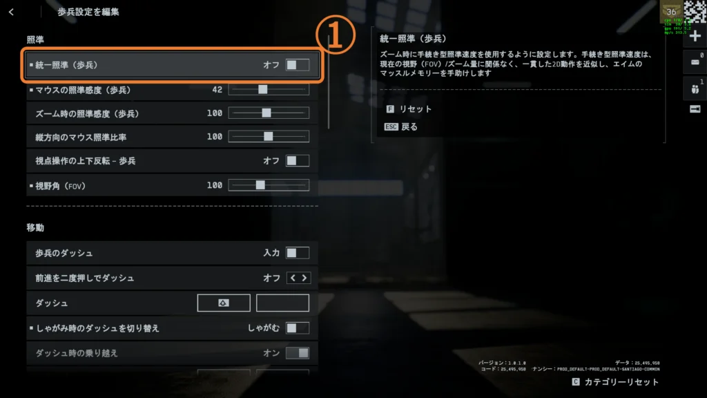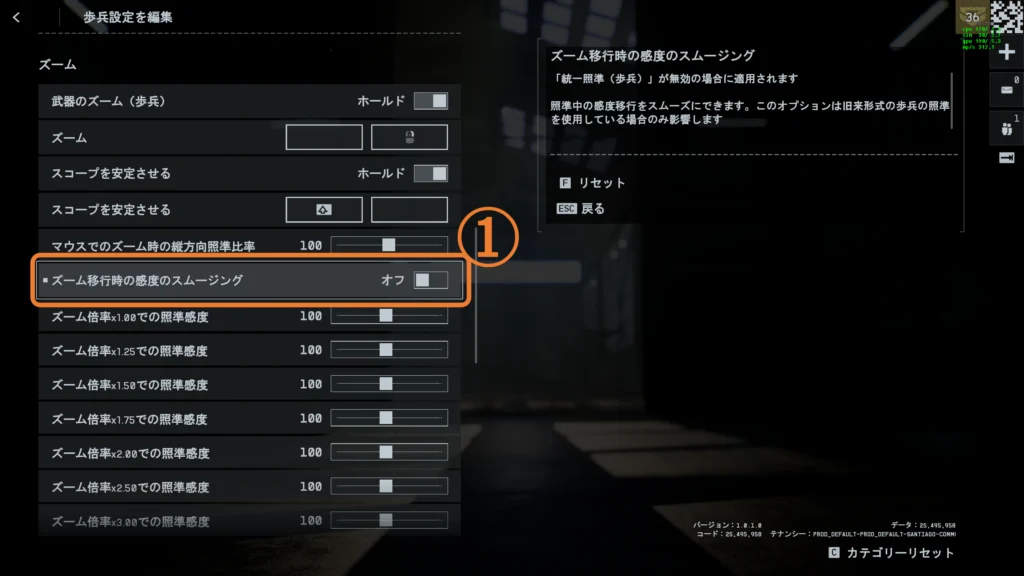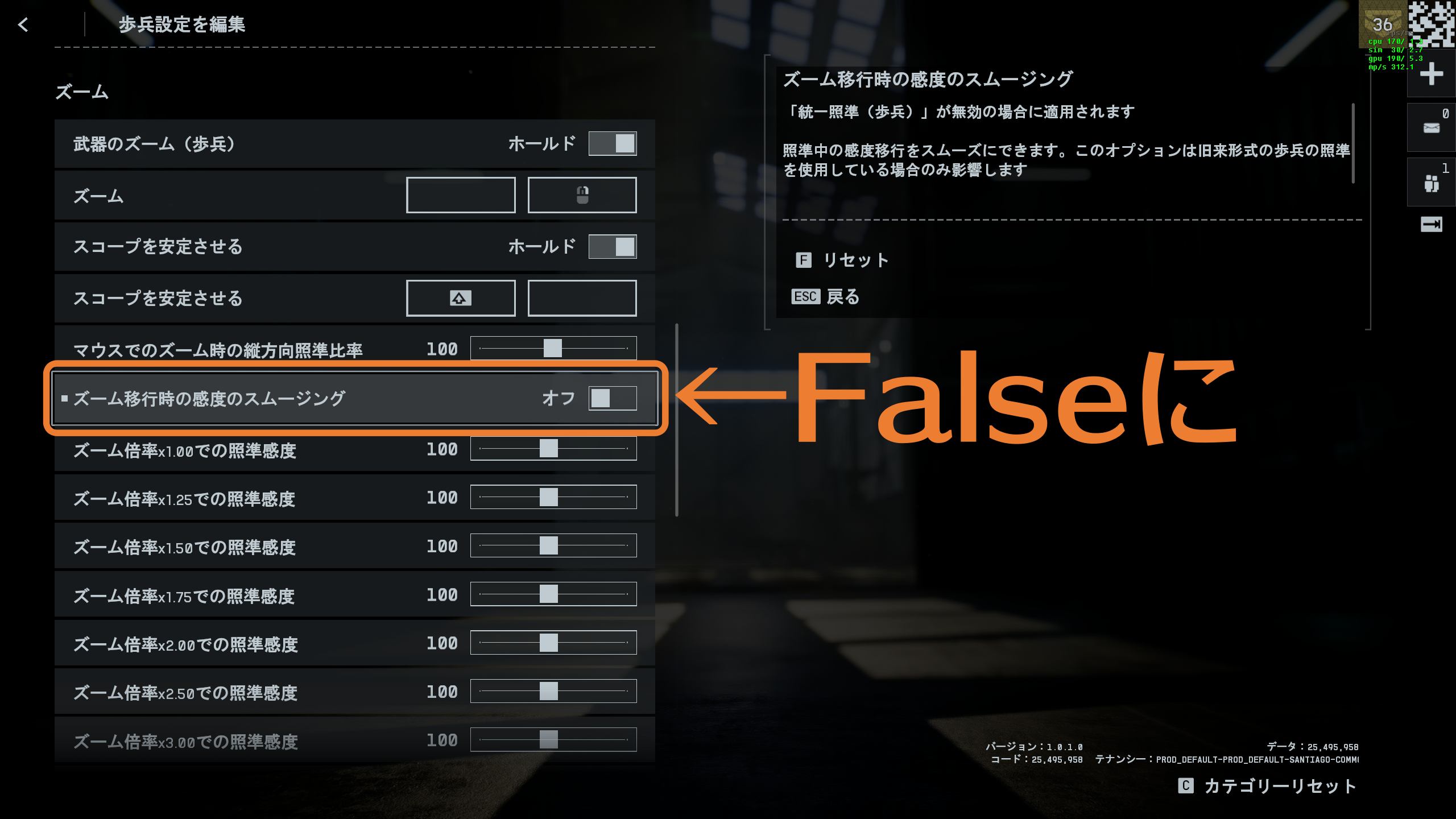 BF6でエイムが滑る、ずれる場合「ズーム移行時の感度スムージング」をFalseにすると直るみたいです。